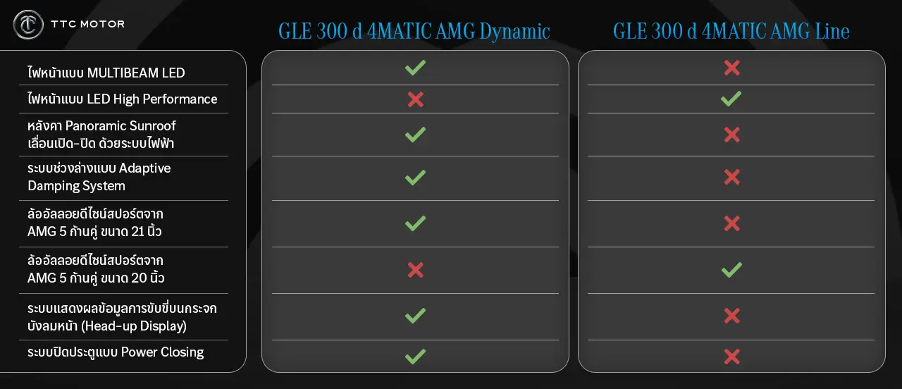 ความแตกต่างเดียวคือ ในรุ่น Mercedes-Benz GLE 300 d 4MATIC AMG Line จะไม่มีระบบแสดงผลข้อมูลการขับขี่บนกระจกบังลมหน้า (Head–up Display) ซึ่งเป็นระบบที่มีเฉพาะในรุ่น AMG Dynamic เท่านั้น